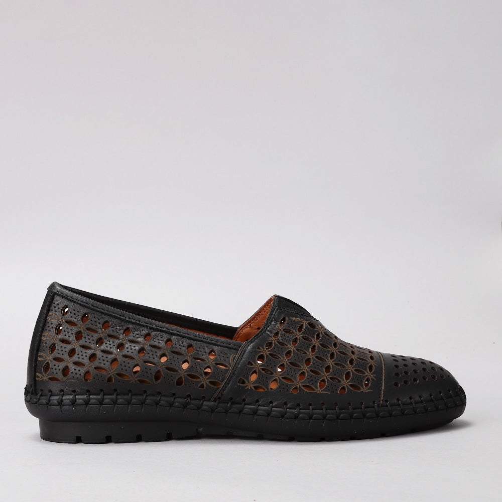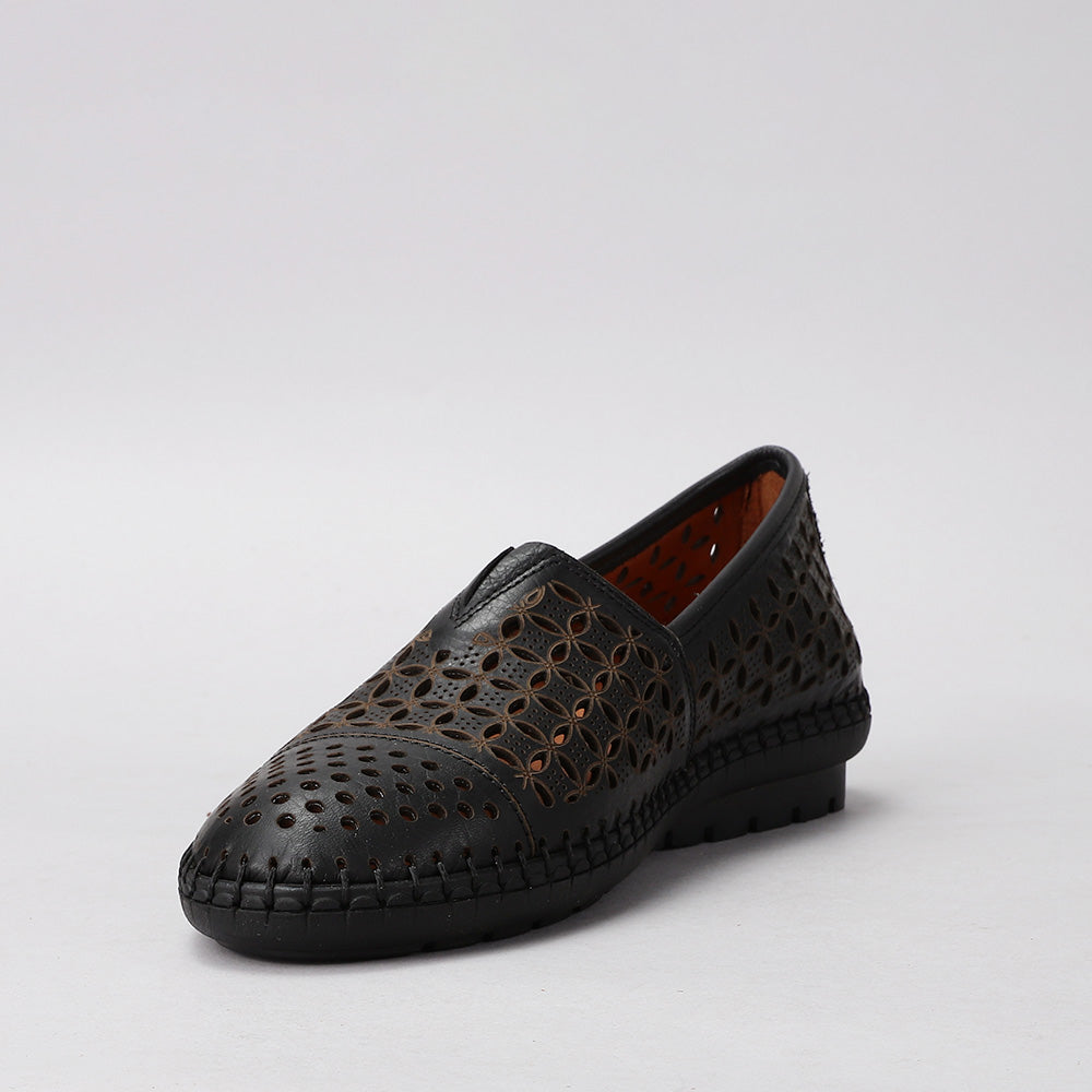 Stay cool and stylish with the Mellow Slip-On. Featuring intricate laser-cut floral patterns for breathability and charm, this lightweight leather shoe is perfect for all-day wear. The soft finish, hand-stitched sole, and easy slip-on design make it a go-to for effortless everyday elegance.