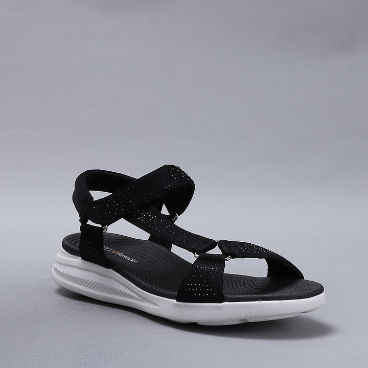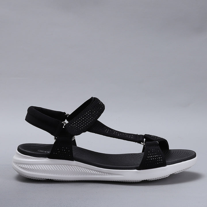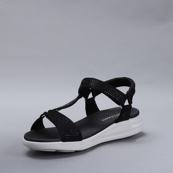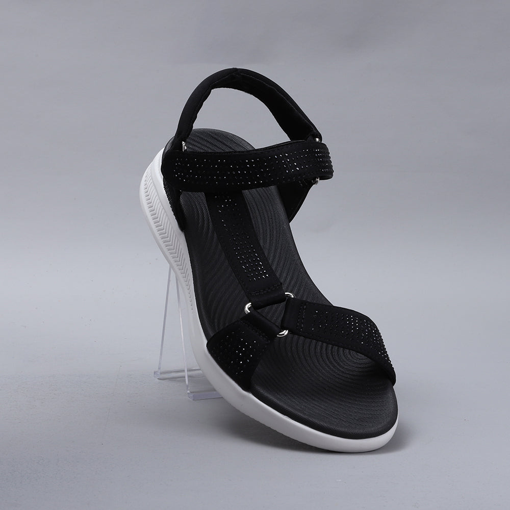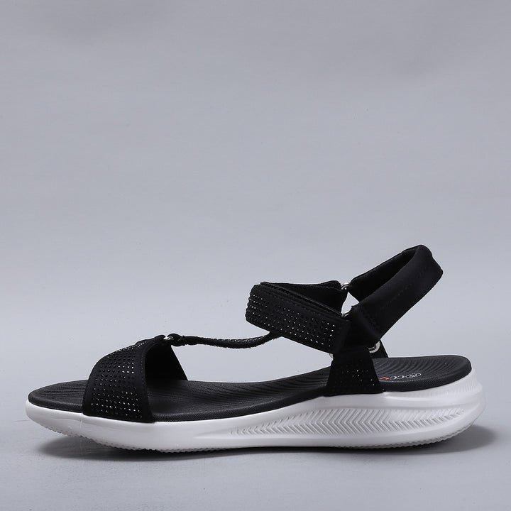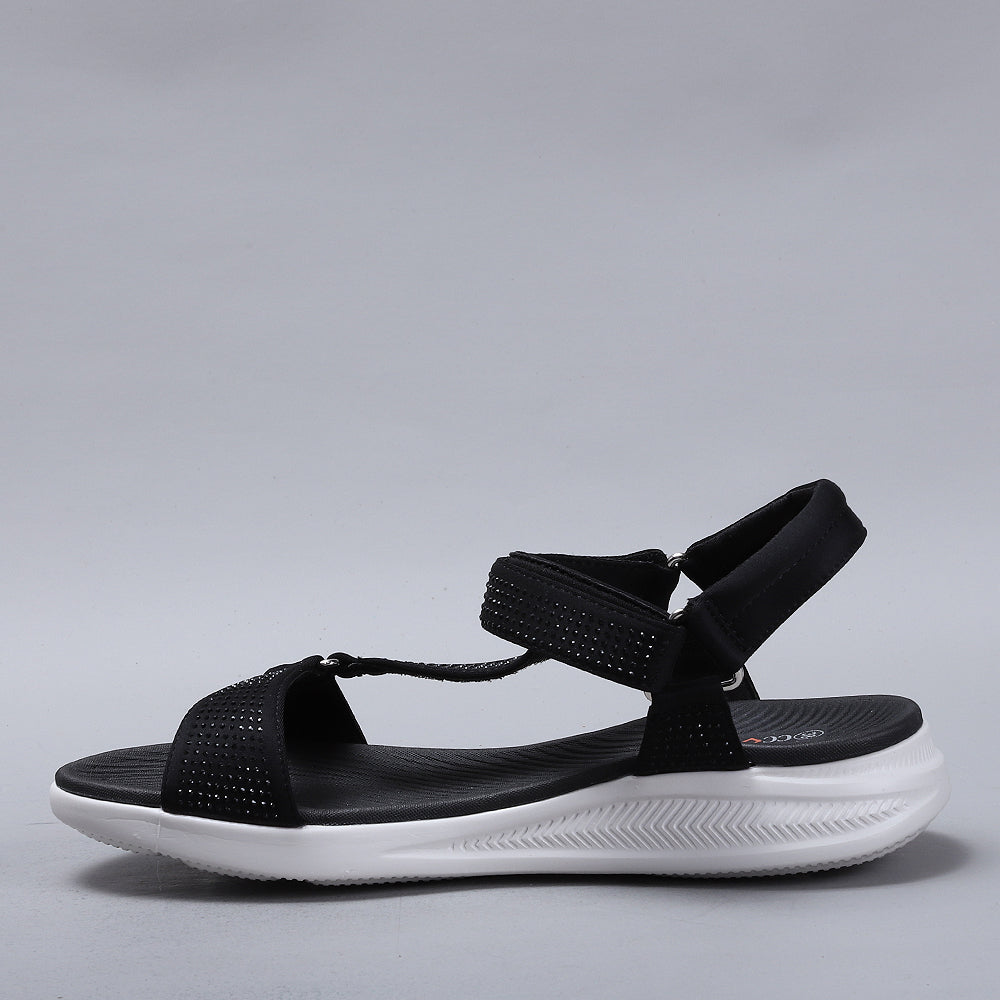 True to size and great walking sandals. Firm but comfortable feel, love the sparkle the diamantés give.