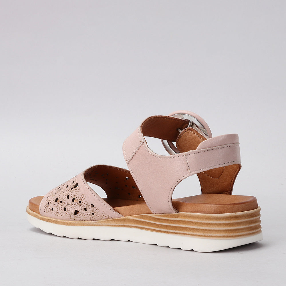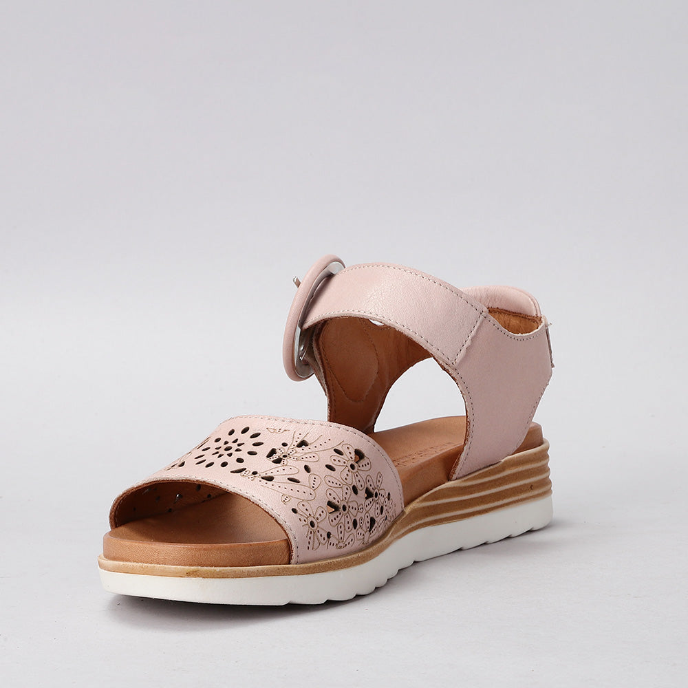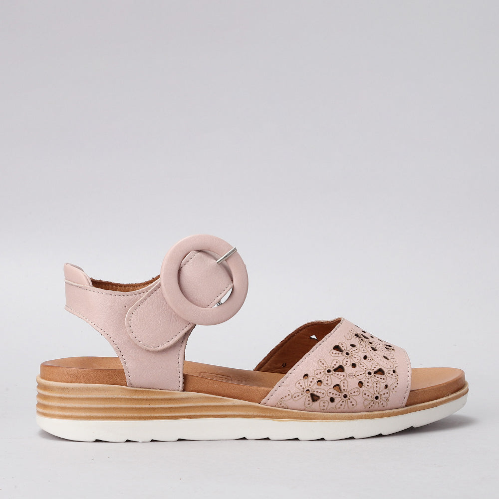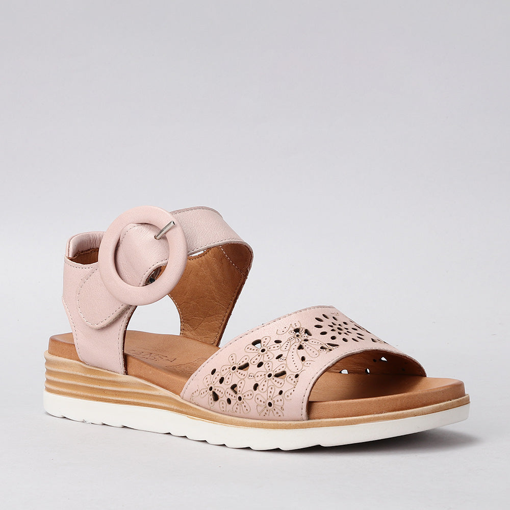 A stylish sandal in soft leather featuring a floral laser-cut design and a statement round buckle. The cushioned footbed and low wedge sole provide lasting comfort, while the adjustable strap ensures a secure, custom fit. Perfect for casual days and summer outings.