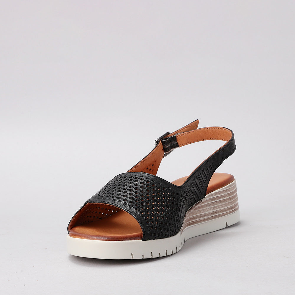 A chic black leather sandal with a perforated design for breathable comfort. Featuring an adjustable slingback strap, cushioned footbed, and a lightweight wedge sole, it offers effortless style and all-day support—perfect for casual wear or dressy summer looks.