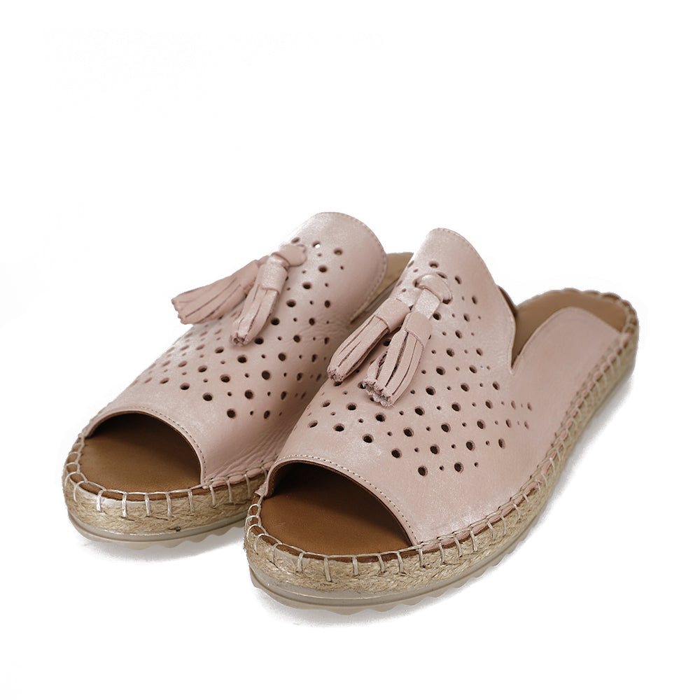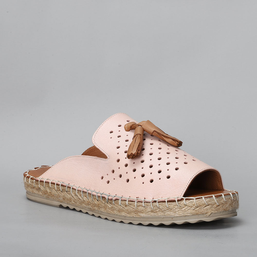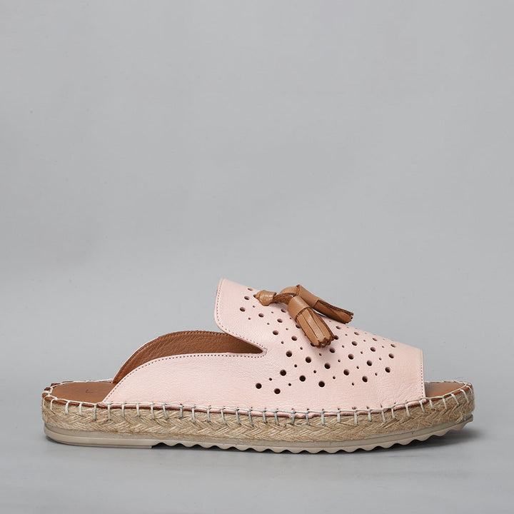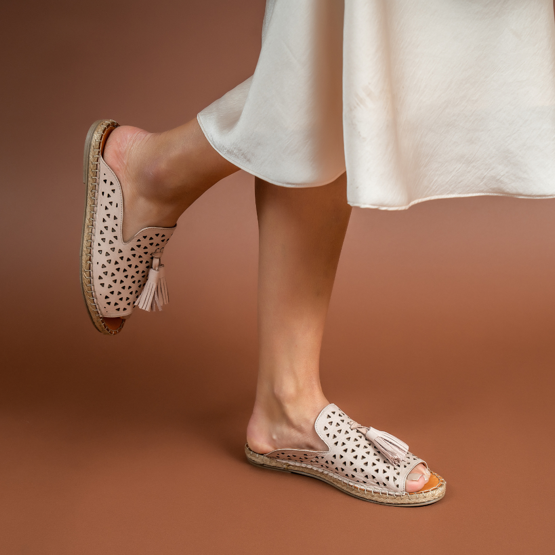 The Dolonda is an espadrille-style slip-on sandal featuring a perforated upper and decorative tassels. It combines casual comfort with a touch of elegance, making it perfect for everyday wear. The braided jute midsole and flexible outsole provide a relaxed yet stylish look.