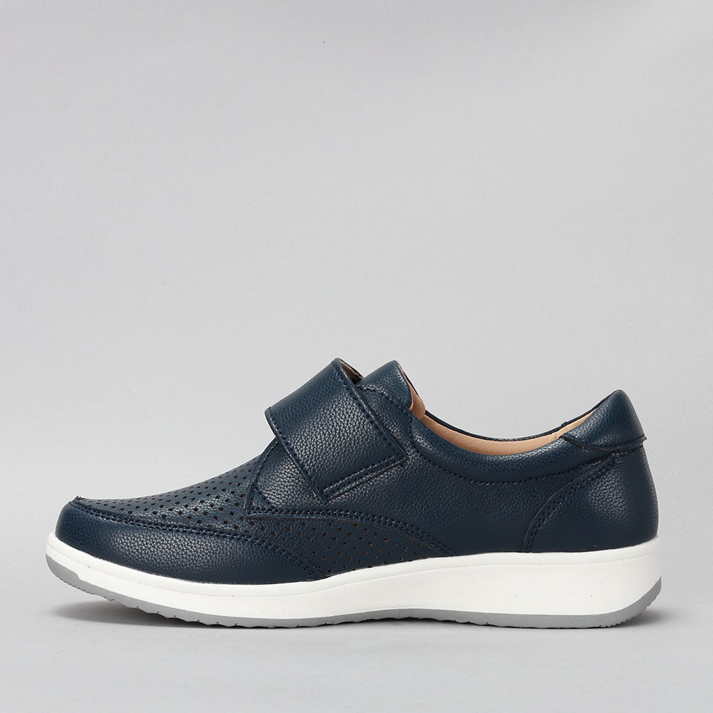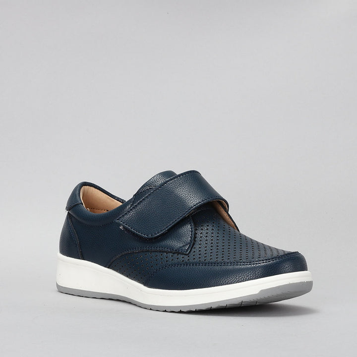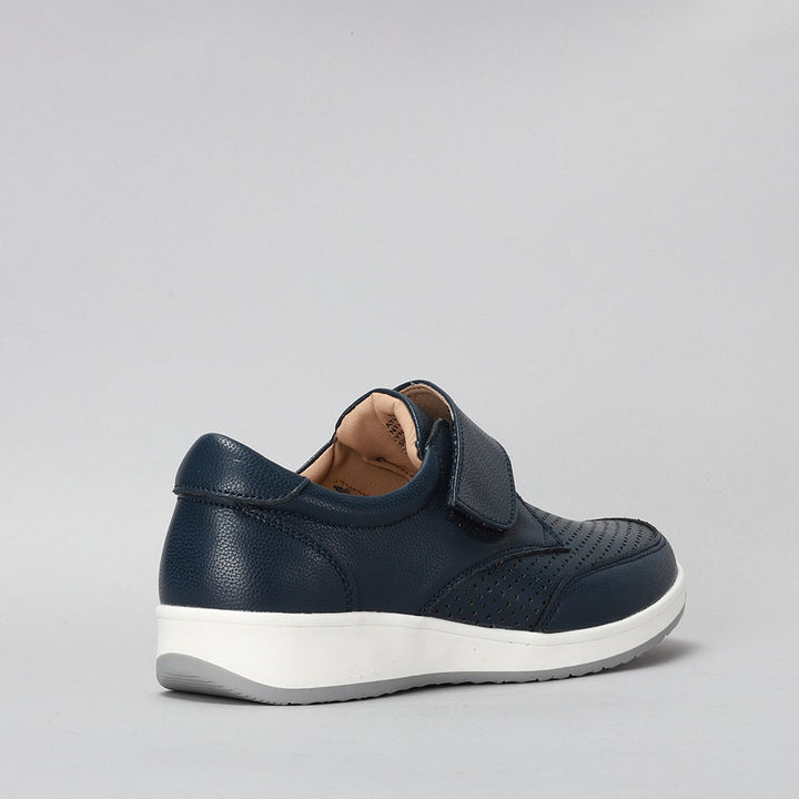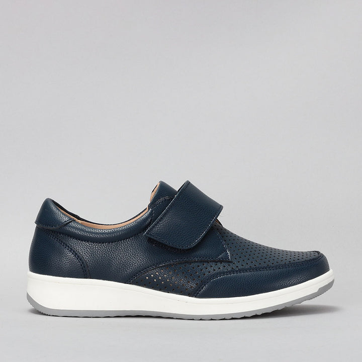 Nell is a lightweight, orthotic-friendly sneaker featuring soft leather, perforated details, a secure velcro strap, and a cushioned sole for all-day comfort and effortless style.