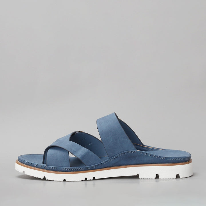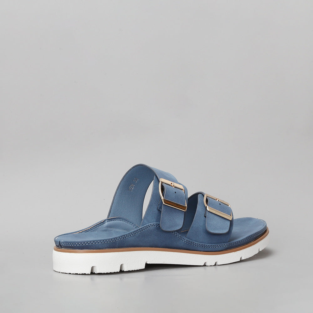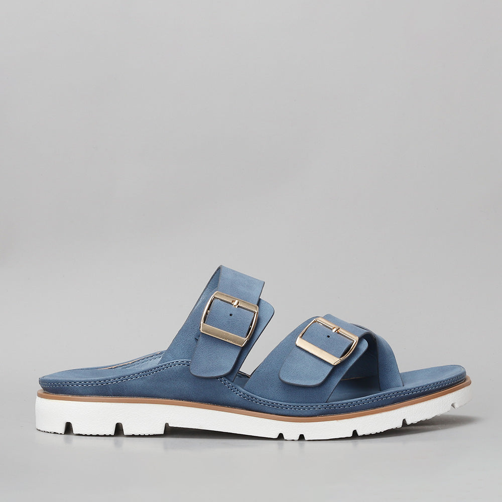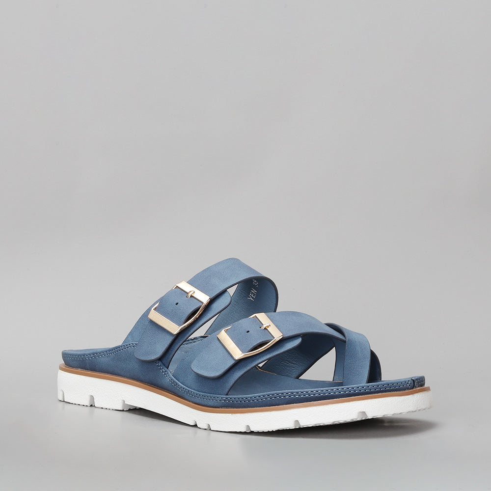 Yen is a stylish slide sandal featuring sleek double straps with bold buckles, perfect for effortless summer looks with a comfortable, modern edge.